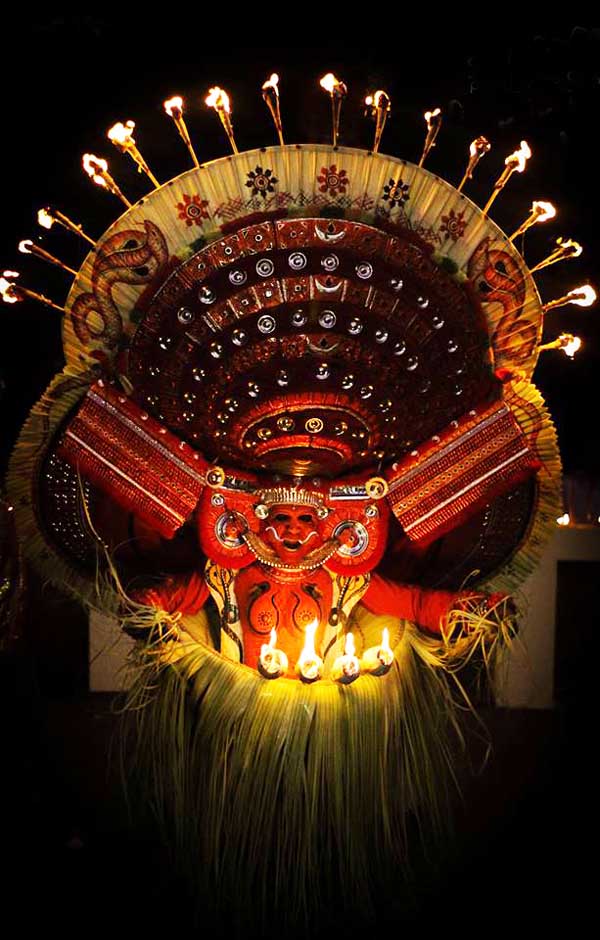 Thalaappan Bhagavathy Theyyam is a rare theyyam limited to a single Tharavadu in Kannur region of Kerala. As per information, this is a fierce manifestation of Mother Goddess Shakti. As per Thalaappan Bhagavathy Theyyam story, Bhagavathi appeared before an elderly person in Thalaappan tharavadu. She was given a place of worship. The Bhagavathy accepted the invitation and made the tharavadu her aaroodam. She blessed the people of the region with peace and prosperity. She protected livestock and cured communicable diseases. To keep her calm and to get her blessings a theyyam is performed annually.